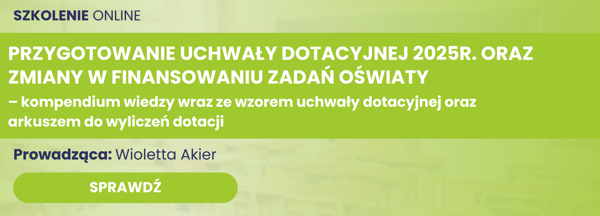 Kliknij grafikę poniżej i poznaj program szkolenia: Przygotowanie uchwały dotacyjnej 2025r. oraz zmiany w finansowaniu zadań oświaty – kompendium wiedzy wraz ze wzorem uchwały dotacyjnej oraz arkuszem do wyliczeń dotacji