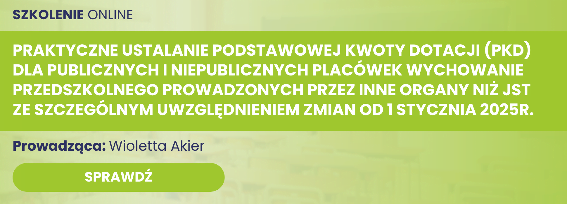 Kliknij grafikę poniżej i poznaj program szkolenia: Praktyczne ustalanie podstawowej kwoty dotacji (PKD) dla publicznych i niepublicznych placówek wychowania przedszkolnego prowadzonych przez inne organy niż JST ze szczególnym uwzględnieniem zmian od 1 stycznia 2025 r.