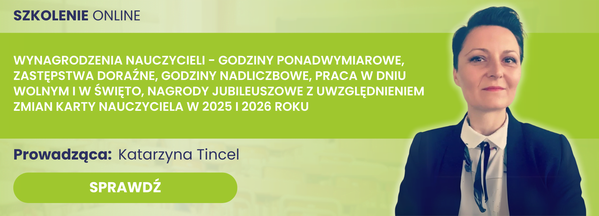 Kliknij grafikę poniżej i poznaj program szkolenia: Wynagrodzenia nauczycieli - godziny ponadwymiarowe, zastępstwa doraźne, godziny nadliczbowe, praca w dniu wolnym i w święto, nagrody jubileuszowe z uwzględnieniem zmian Karty Nauczyciela w 2025 i 2026 roku
